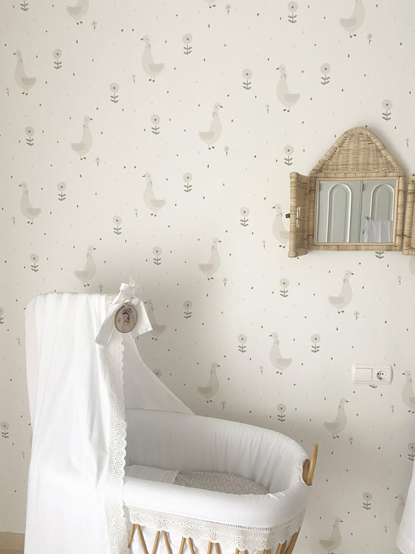 Carla Pérez (@deco_miauu) ha creado un espacio encantador y sereno para su bebé utilizando el papel pintado Gansa Lucy, diseñado en una paleta de tonos suaves de gris y verde. Este papel pintado e...