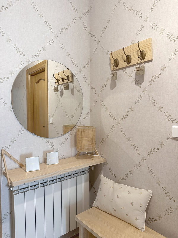 María Lourdes de @UvasYColor ha renovado su recibidor creando un espacio muy acogedor nada más entrar en casa con el papel pintado Rosegarden Lino, un diseño clásico de hojas y flores con un acabad...
