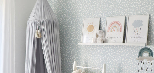 Inspírate en este cuarto de juegos alegre y lleno de vida, decorado con nuestro papel pintado Ramitas Azul.