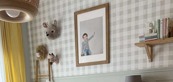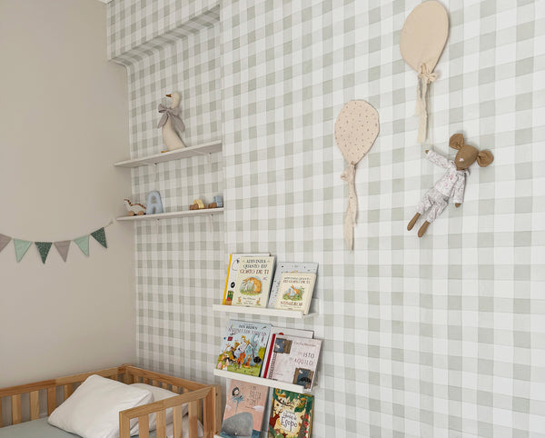 Conoce los detalles de la habitación de Eric, con una decoración suave en tonos neutros de verde con el papel pintado Vichy verde y moldura de pared.