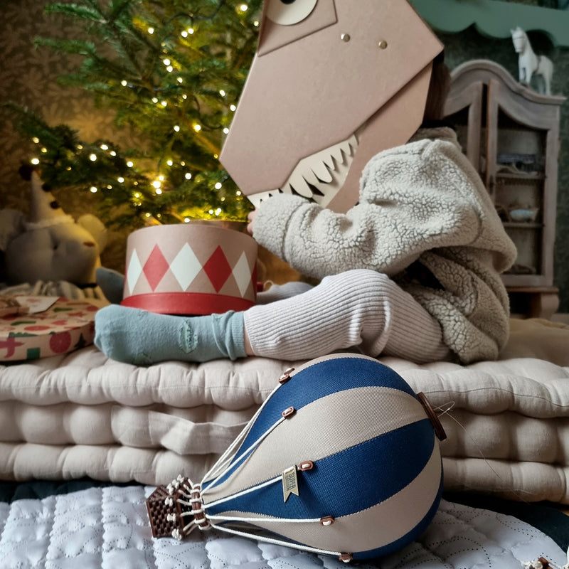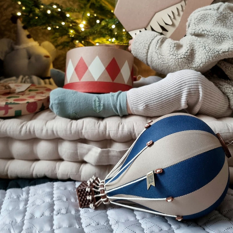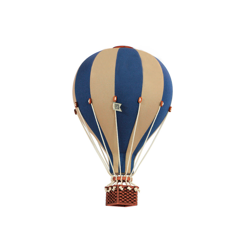 The hot air balloon model in navy blue and raw beige adds an elegant touch to children's decor due to its sober and easy-to-match tone.