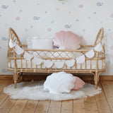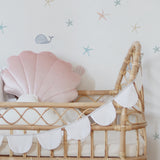 Per le foto, abbiamo abbinato la ghirlanda di bandierine bianco perla con cuscini a conchiglia e il nostro carta da parati Fondo Marino per creare un'atmosfera ispirata al mare!