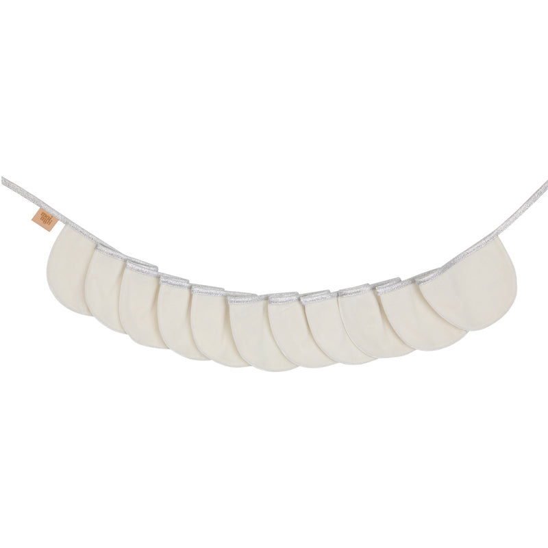Realizzata in morbido e bellissimo velluto bianco perla, la ghirlanda di bandierine a forma di mezzaluna completa la decorazione della cameretta dei bambini con un tocco festoso molto allegro. Può essere utilizzato appeso al muro, per decorare la culla o il lettino, il baldacchino o la finestra. Sono pezzi utili anche per decorare le feste dei bambini, sono ideali per una tavola di compleanno o di battesimo.