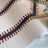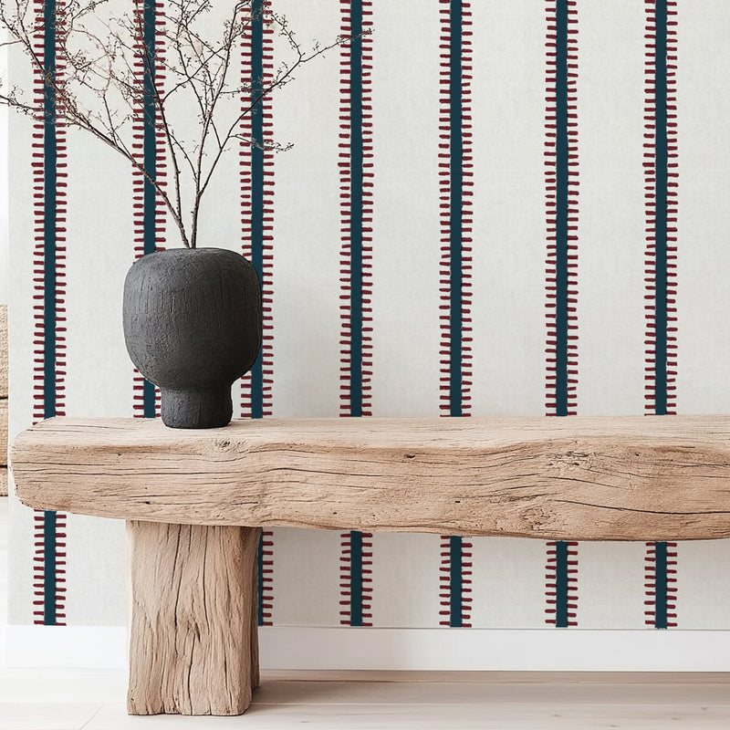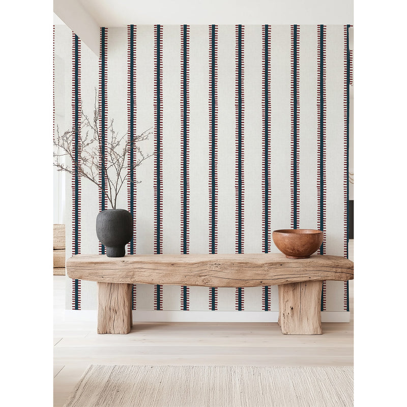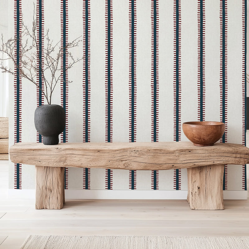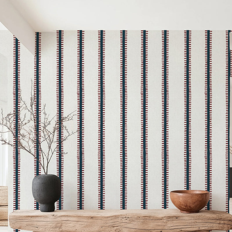 La Carta da Parati vinilica A righe Ruby Navy combina blu navy e rosso granata in un design di righe stilizzate su uno sfondo bianco crema. La sua finitura con texture lino dona profondità e calore, creando un ambiente accogliente in qualsiasi spazio.