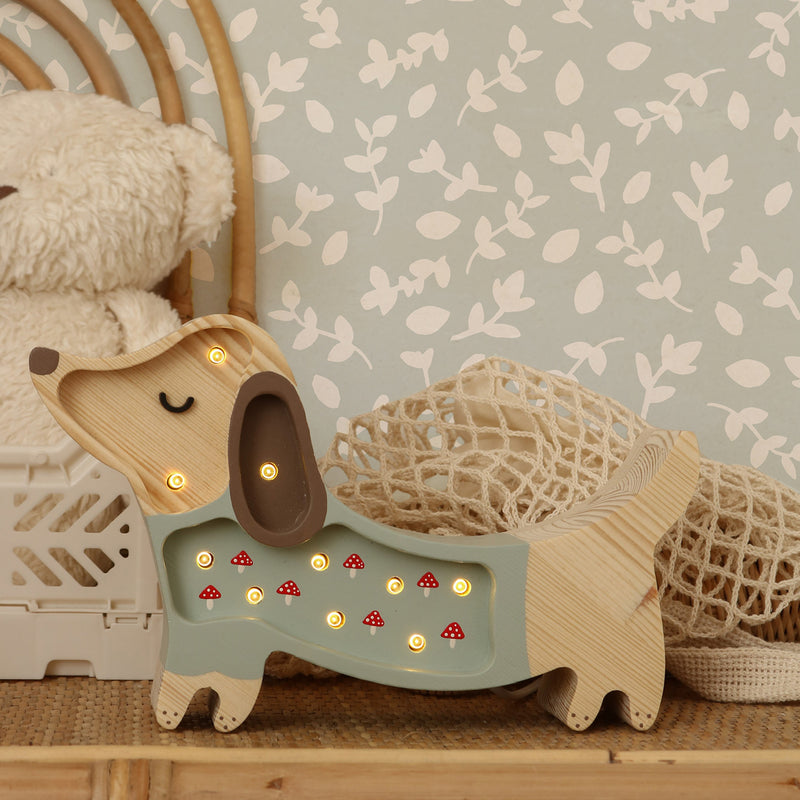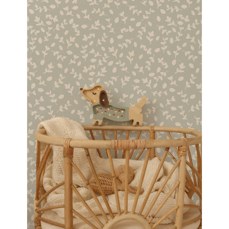 La ropita del cachorro está pintada a mano con un precioso color verde mint y decorada con graciosas setas rojas que dan un toque divertido al diseño. En las fotos, la Lámpara mini Cachorro está combinada con nuestro papel pintado Ramitas verde.