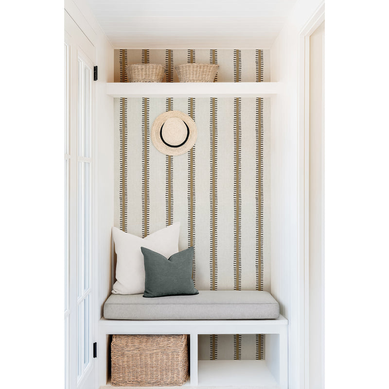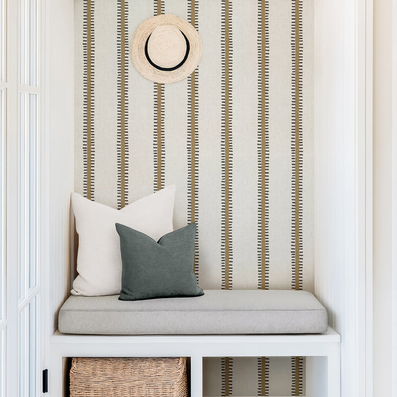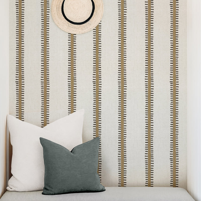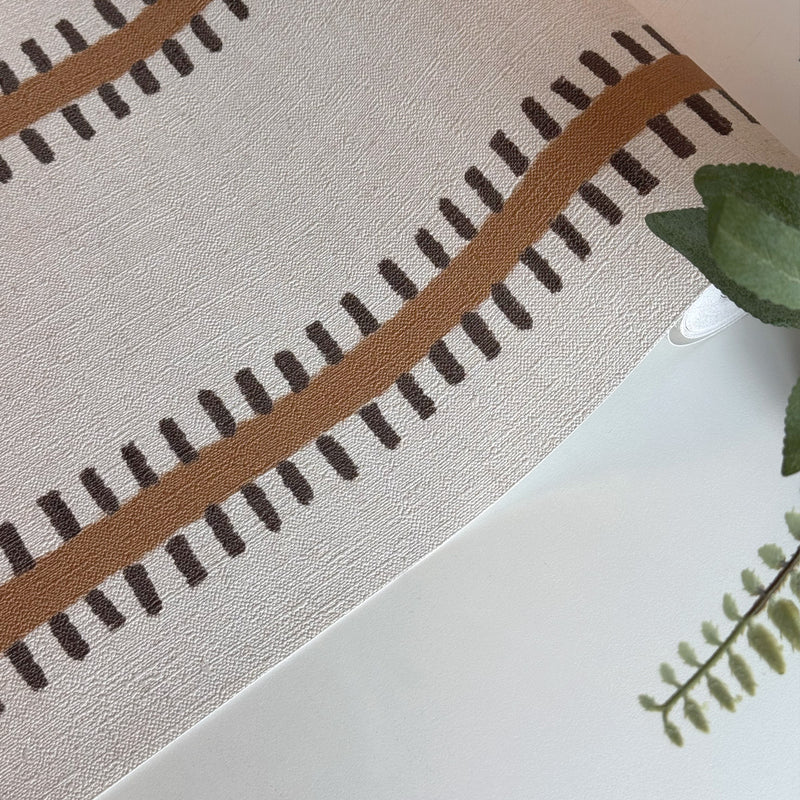 Rayas Pati Camel es un papel pintado vinílico con un moderno diseño de rayas estilizadas en tono camel y detalles en negro grafito sobre un fondo blanco crema. La textura efecto lino añade profundidad y un acabado natural al ambiente.