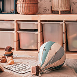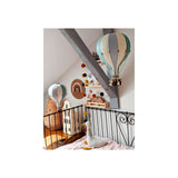 Com uma preciosa combinação de cores de verde menta, azul claro acinzentado e branco cru, este balão decorativo aerostático suspenso decora o quarto infantil e estimula a imaginação dos mais pequenos, criando um ambiente lúdico e mágico.